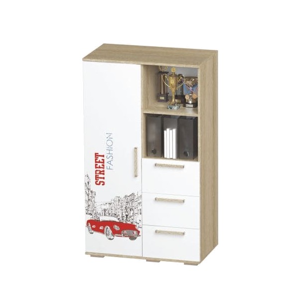 Шкаф многофункциональный ШК-10 "Сенди" имеет закрытое отделение, комплектующееся полкой и штангой для одежды, открытую нишу с полкой и 3 выдвижных ящика.