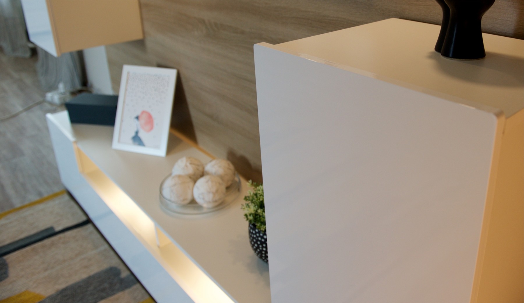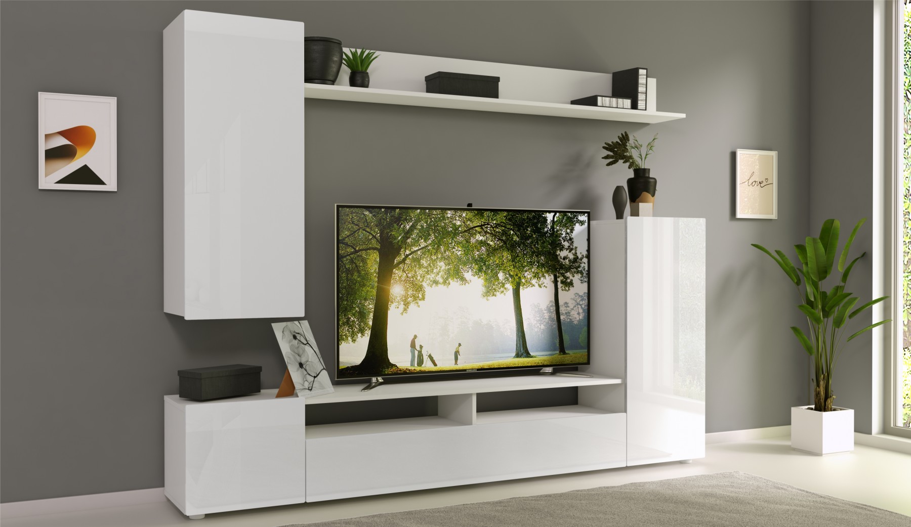 Стенка Лия выполнена в современном европейском стиле. Её дизайн совмещает в себе современные тренды: белый глянец, скругленные фасады МДФ, отсутствие лицевой фурнитуры. Белый цвет отлично сочетается со всей цветовой палитрой, что позволяет создавать яркий интерьер и компоновать с другой мебелью. Стенка включает в себя нишу под ТВ с открытыми и закрытыми полками для размещения приставок, медиа устройств, книг и элементов декора. Дополнительно гостиная комплектуется точечной подсветкой.