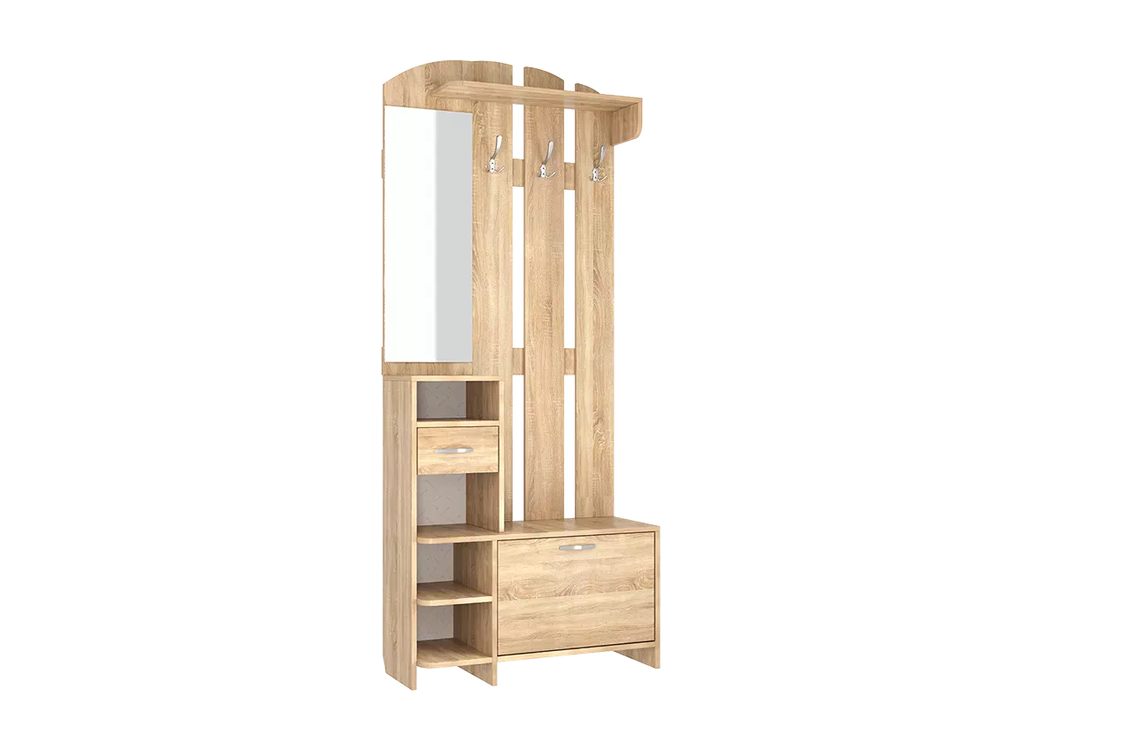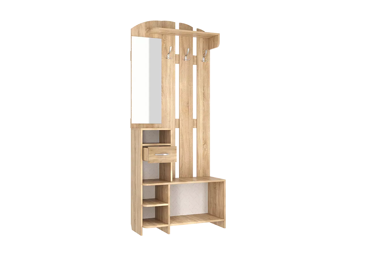 • Прихожая Мила: эффективное решение для оптимального использования пространства, сочетающее в себе открытую вешалку с крючками, место для обуви, компактное зеркало и удобный ящик с полочками для всевозможных мелочей.