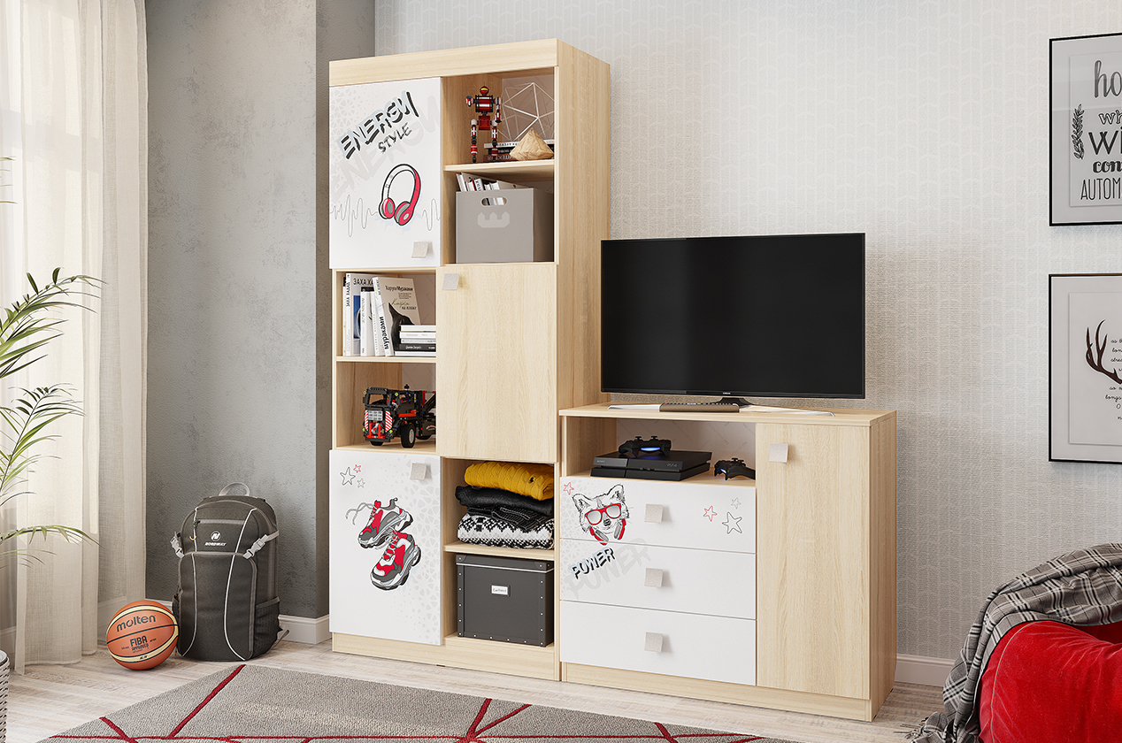 Состоит из 6-ти открытых ниш и 3-х закрытых. Стеллаж идеально подойдет для книг, игрушек и мелочей. Эффектный принтерный рисунок на фасадах выдержан в общем стилистическом решении. Рисунок устойчив к истиранию и ультрафиолету.
