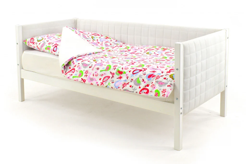 Комплект кровати состоит из каркаса кровати, мягких чехлов на бортики и ортопедического основания. Дополнительный бортик, ящики, матрас и постельные принадлежности приобретаются отдельно.