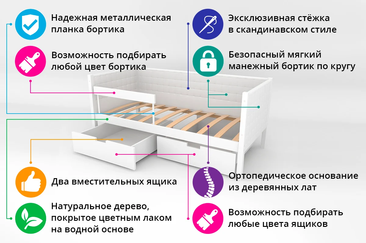 Комплект кровати состоит из каркаса кровати, мягких чехлов на бортики и ортопедического основания. Дополнительный бортик, ящики, матрас и постельные принадлежности приобретаются отдельно.