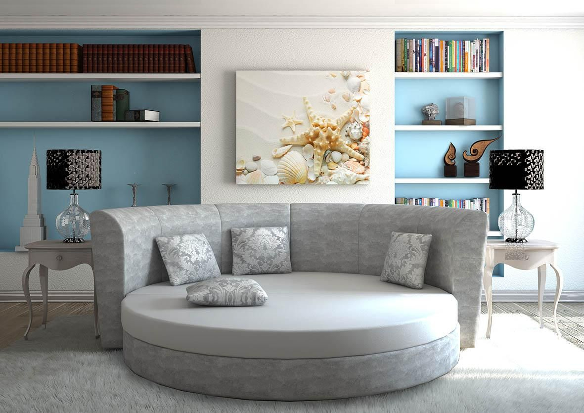 Необычная система трансформации в круглую кровать. При этом, в сложенном виде представляет собой изящный полукруглый диван для гостиной. Удобный размер спального места: в разложенном виде спальное место 200 на 207 см, что позволяет на круглой кровати комфортно разместиться двум достаточно высоким людям. Экологичное покрытие спального места: в разложенном виде простынь застилается на дышащую хлопковую ткань, которая используется при изготовлении матрасов. Сдвоенный короб для хранения постельных принадлежностей. Крышка каждого сектора короба открывается отдельно. Различные виды тканей, можно подобрать любые материалы и для спинки, и для основания, и для подушек, создавая неповторимые сочетания и расставляя цветовые акценты.