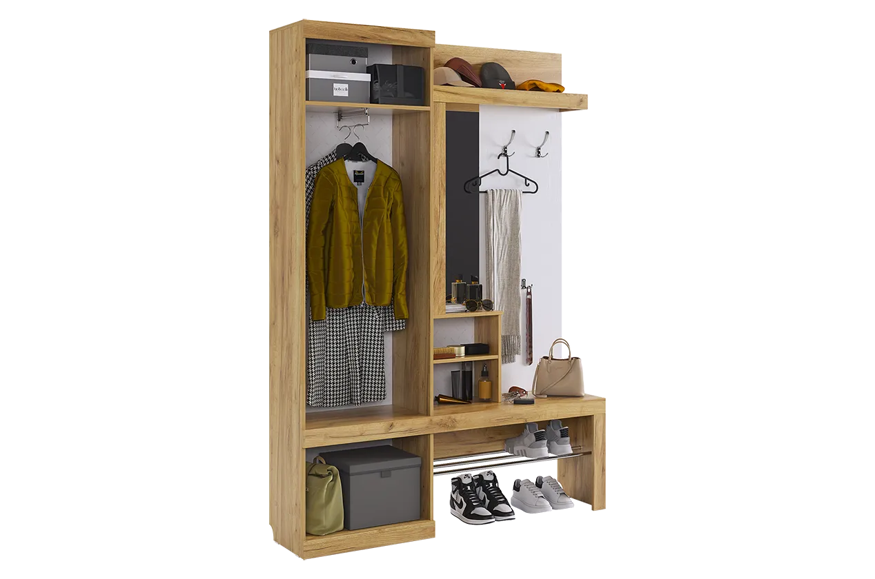 Прихожая Алекс включает в себя три основных блока. Открытые ниши предлагают место для размещения одежды и сумок на металлические крючки. Элегантное решение с хромированными трубками идеально подходит для хранения повседневной обуви. Закрытый шкаф-гардероб обеспечивает дополнительное пространство для несезонной обуви и верхней одежды. Ниша-трюмо с зеркалом и боковыми полками делает утренний уход удобным и быстрым. Закрытый шкаф под зеркалом предлагает дополнительное пространство для хранения различных аксессуаров.