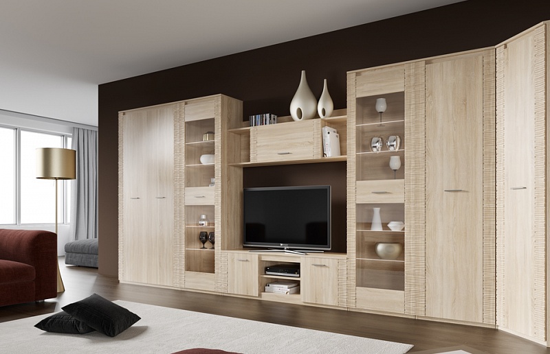 Гостиная «Элана» обязательно покорит любителей минимализма и сторонников практичности, ведь она может комплектоваться по Вашему желанию различными шкафами достаточной вместимости и полками, на которых удобно разместятся и важные мелочи.