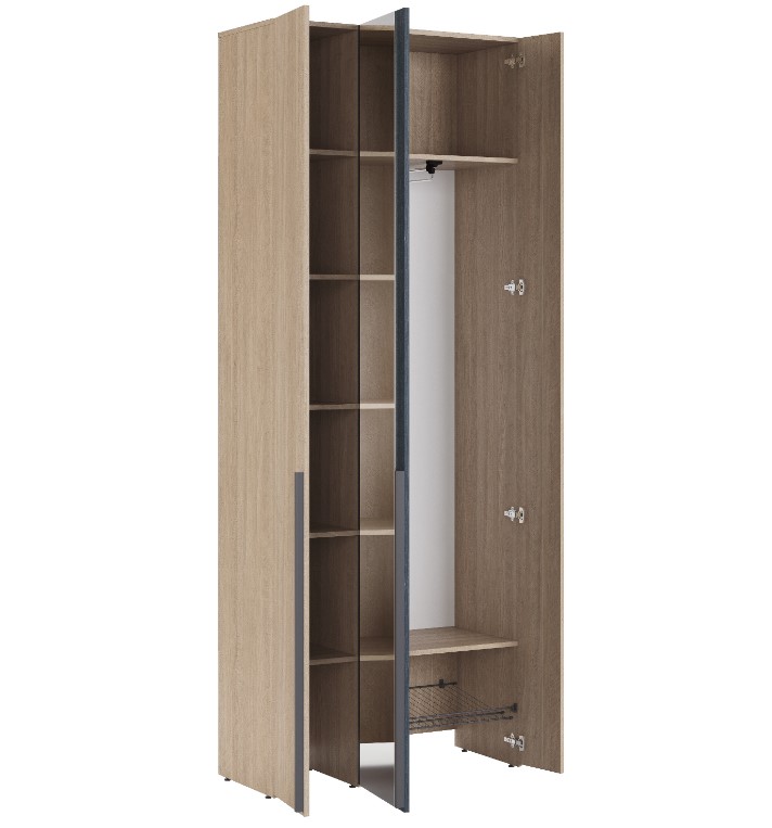 Возможность поменять местами 2 крайних правых фасада. Толщина ЛДСП 16 мм. Кромка 0,4 мм (ПВХ). Ручка накладная длинная 974мм, выполнена из ПВХ пластика, окрашенного краской графитового цвета. Шкаф имеет три распашных фасада, на одном из фасадов приклеено зеркало. Для крепления фасадов используются европейские четырехшарнирные петли фирмы Titus (Словения) с доводчиком. Шкаф имеет три отделения за двумя дверками справа. Отделение для хранения верхней одежды комплектуется выдвижной штангой. Нижнее отделение укамплектовано металлической сетчатой полкой, окрашенной полимерной антисколовой краской графитового цвета. Отделение за левым фасадом укомлектовано пятью полками. Задние стенки ЛДВП накладные. Модуль стоит на регулируемых подпятниках. Рекомендуется крепление шкафа к стене.