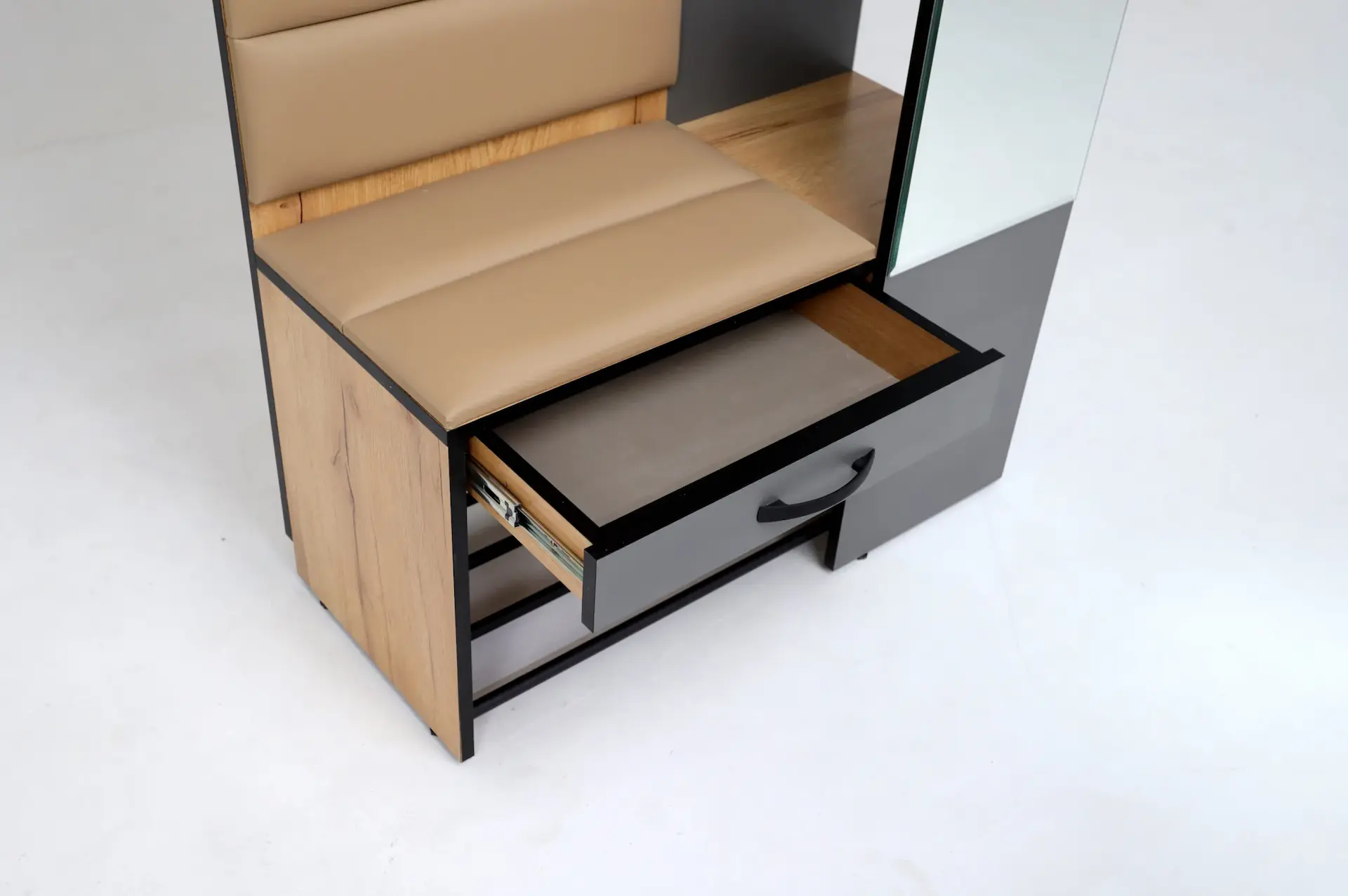 Прихожая «Ольга Лофт» серые фасады и черная кромка. Фурнитура и мягкий элемент создают законченный образ прихожей.