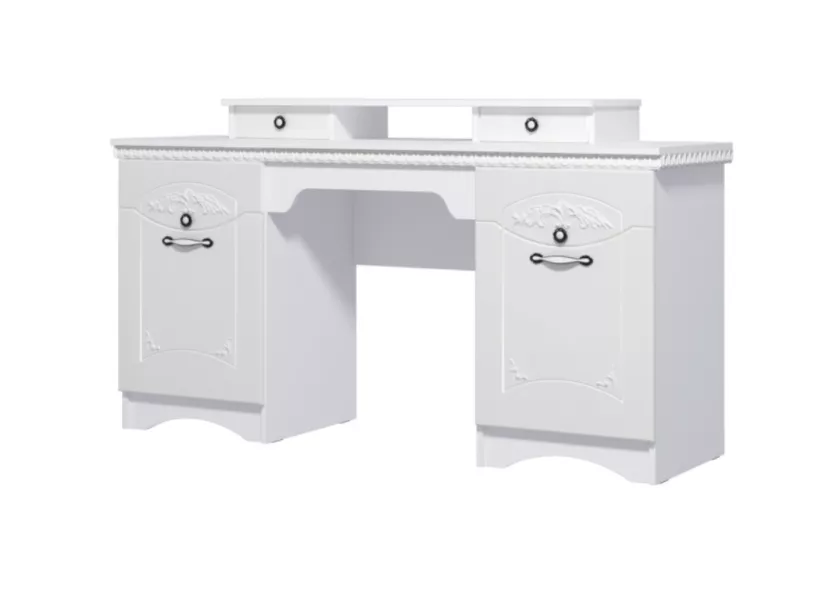 Изящный и функциональный туалетный стол. В двух тумбах стола расположены по одному выдвижному ящику и по одной нише за распашной створкой. В небольшой надстройке на столешнице стола также расположены два небольших ящика. Для обустройства удобного туалетного уголка, столик можно доукомплектовать за отдельную плату зеркалом или банкетками из этой же серии.