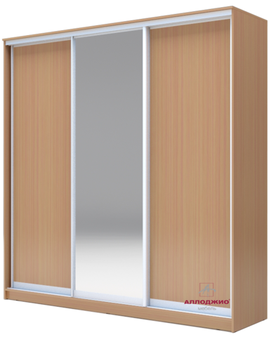 Шкаф оснащен двумя дверями-купе с наполнением из ДСП 10 мм и одной дверью-купе с наполнением зеркало серебро.