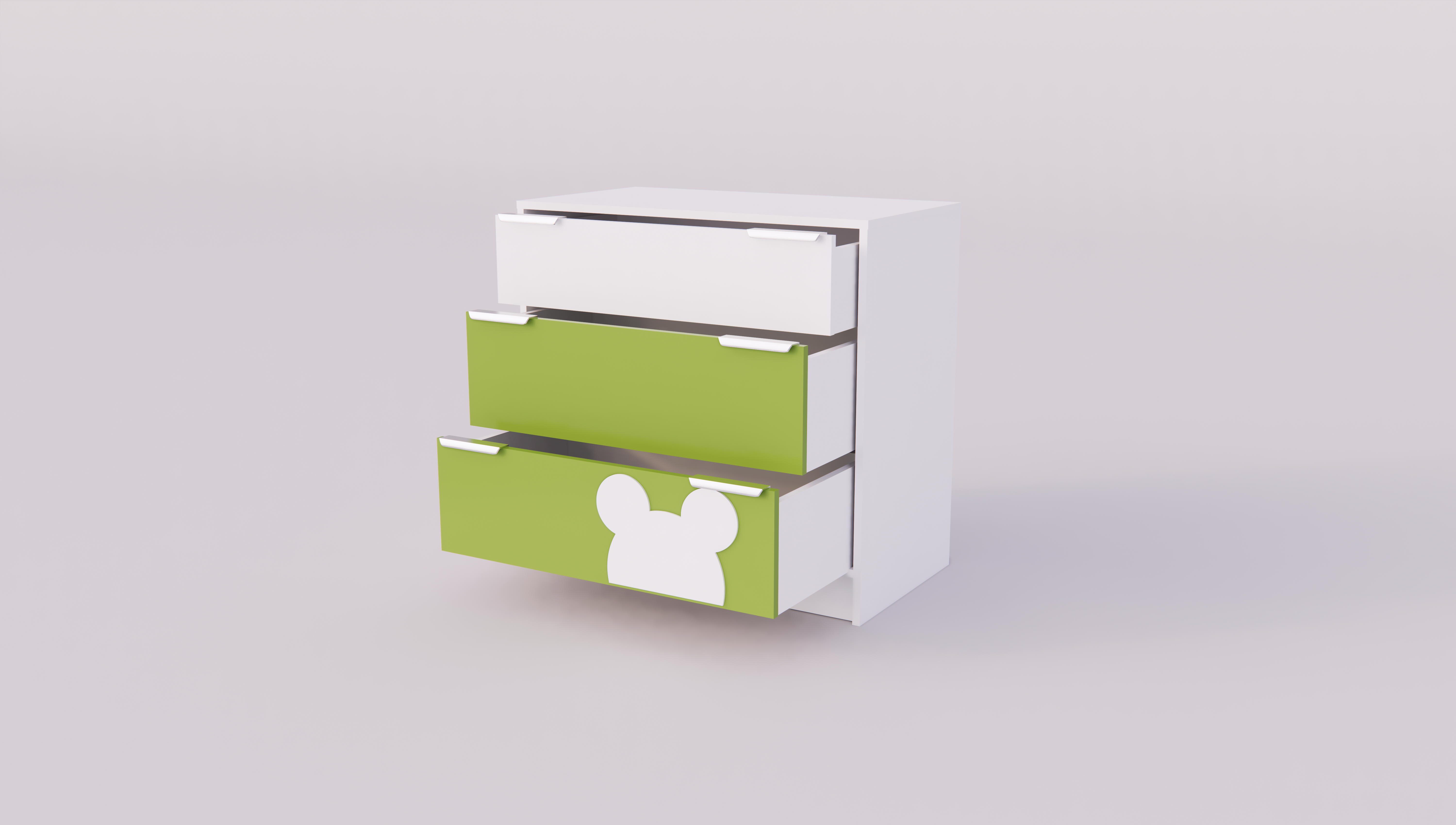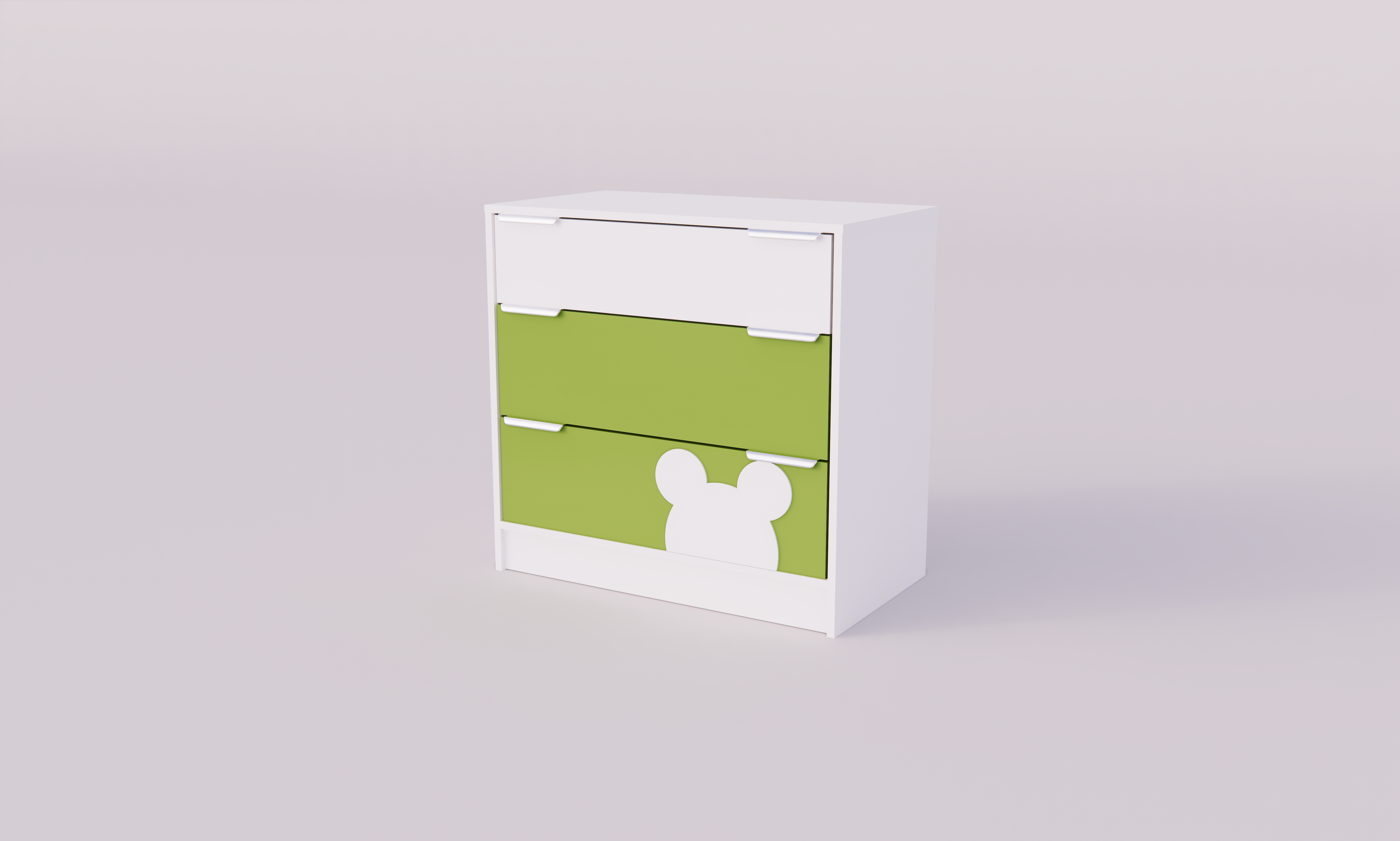 Трехсекционный комод в детскую комнату. Включает три вместительных ящика с фрезерованными ручками для хранения вещей. Все ящики на роликовых направляющих, на фасадах – безопасные невыступающие ручки, удобные для захвата рук. Каждый ящик выдерживает до 8 кг распределенной нагрузки. Все торцы комода обработаны. За счет оригинального декора на дверцах и лаконичного дизайна комод будет гармонично смотреться в любом интерьере.