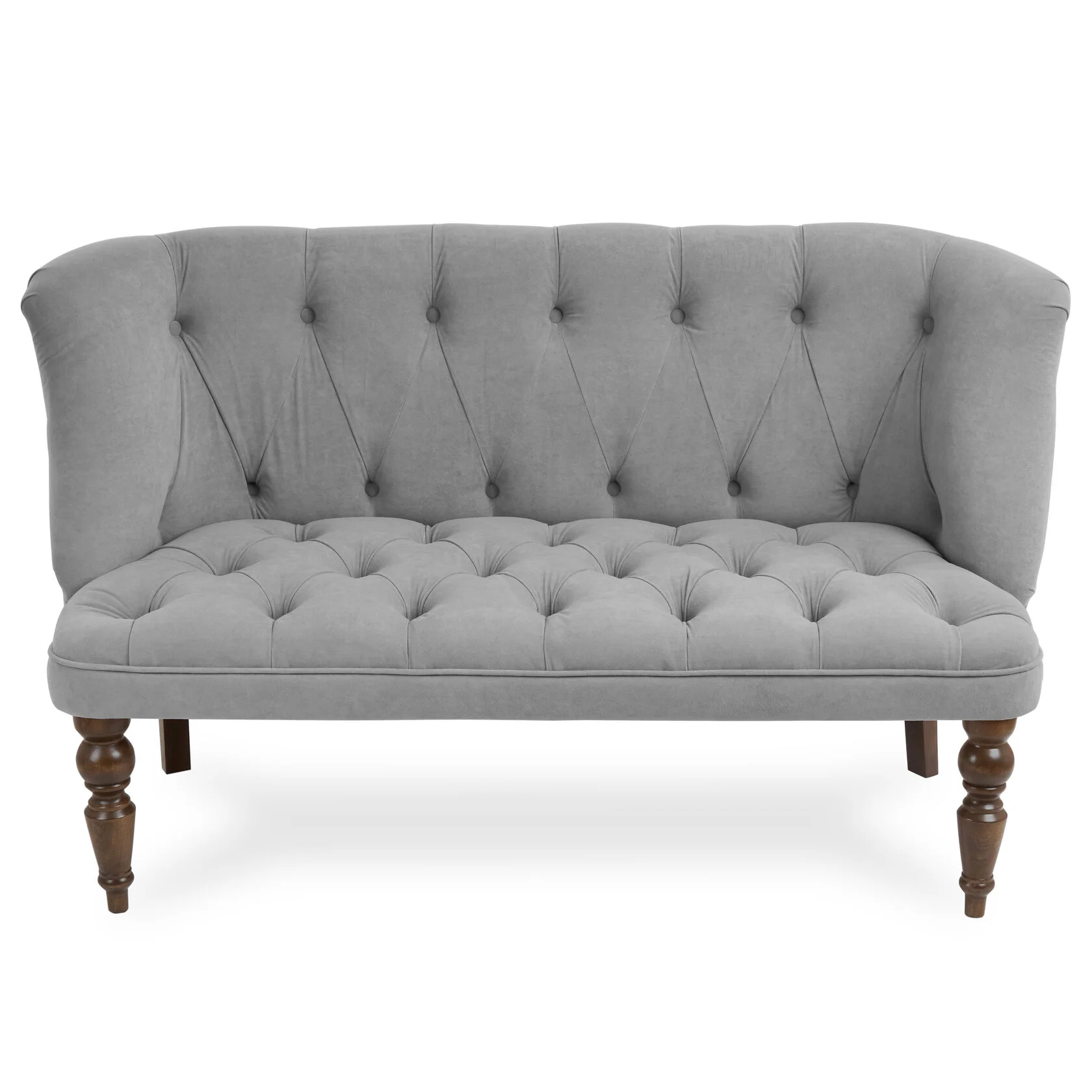 Двухместный прямой диван с изящным изголовьем и резными ножками из натурального дерева никого не оставит равнодушным.