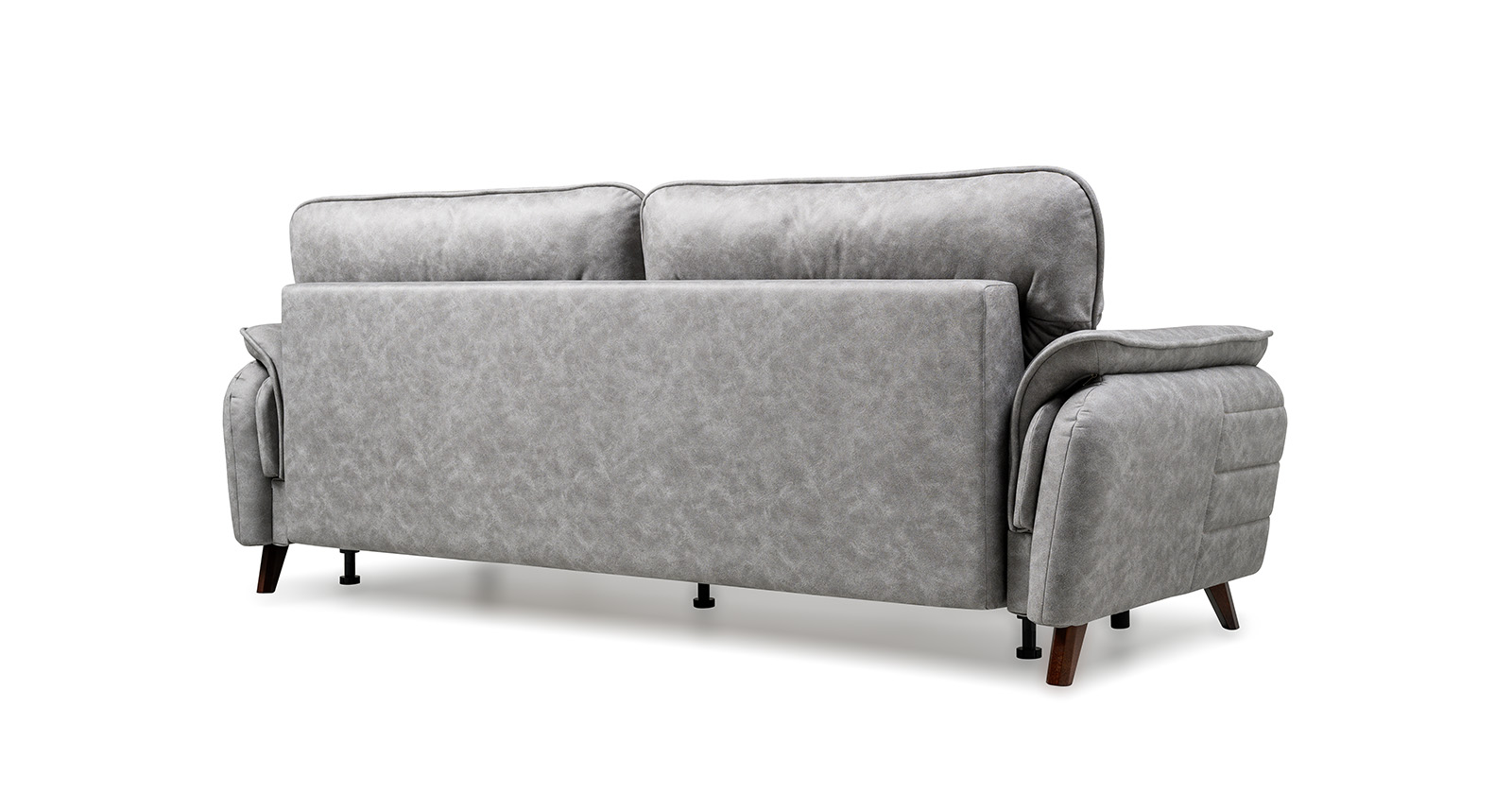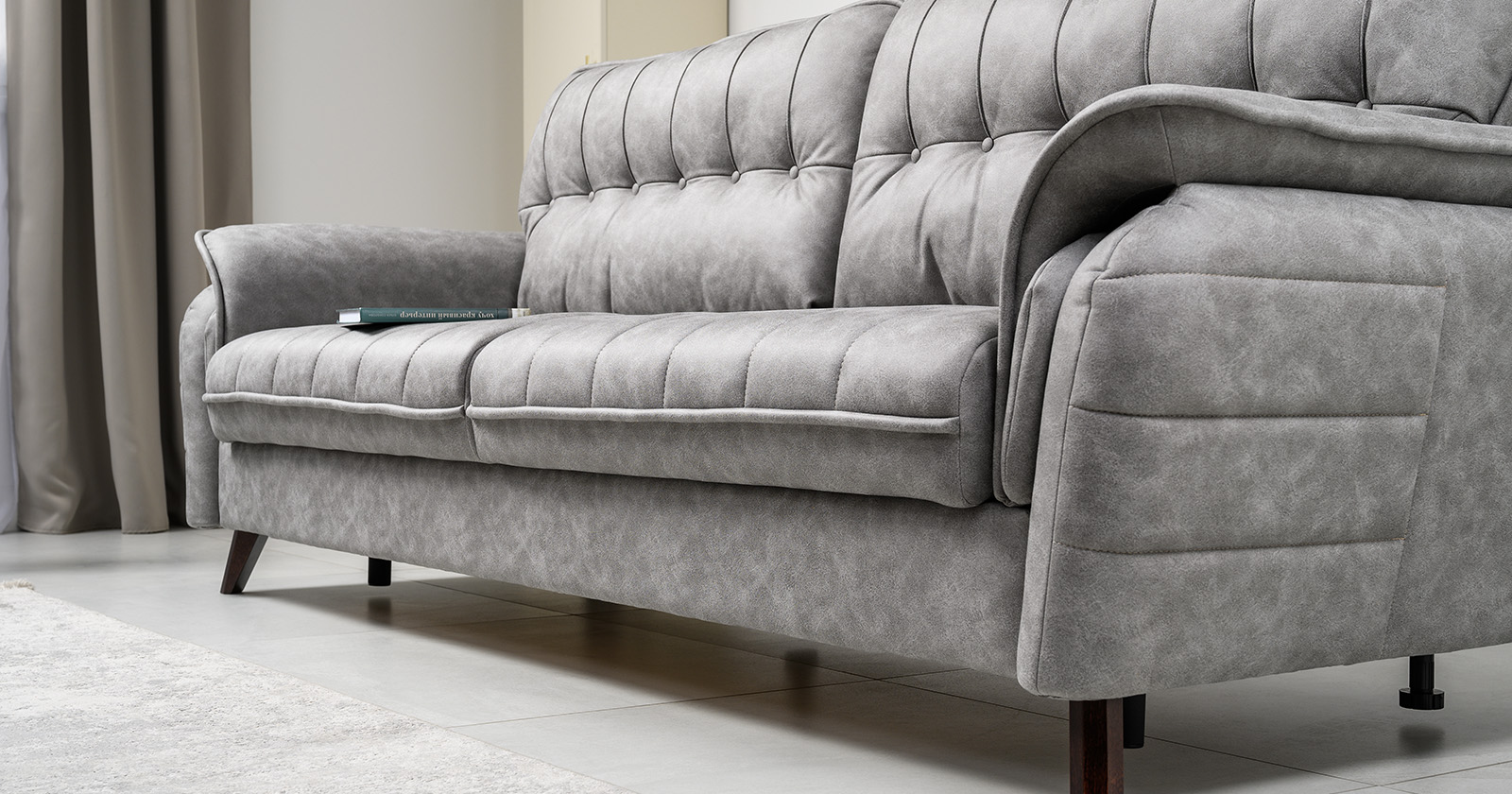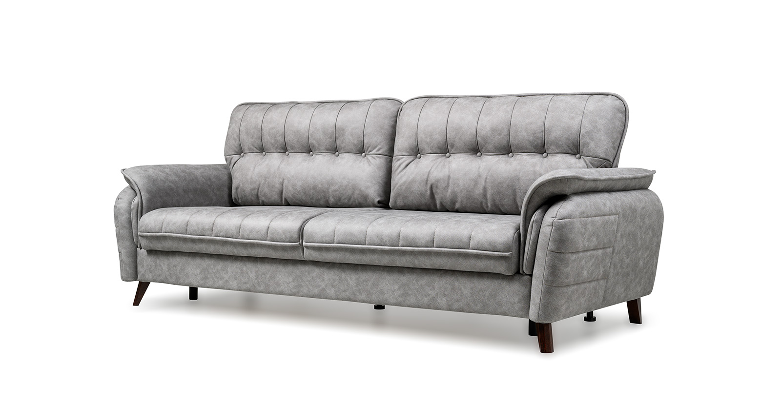 Декоративные канты на подушках дивана, подлокотниках и сиденье. Стежка на передней части сиденья и внешней части подлокотника. Защипы на верхней части подушки. Втяжки с пуговицами на приспинных подушках.
