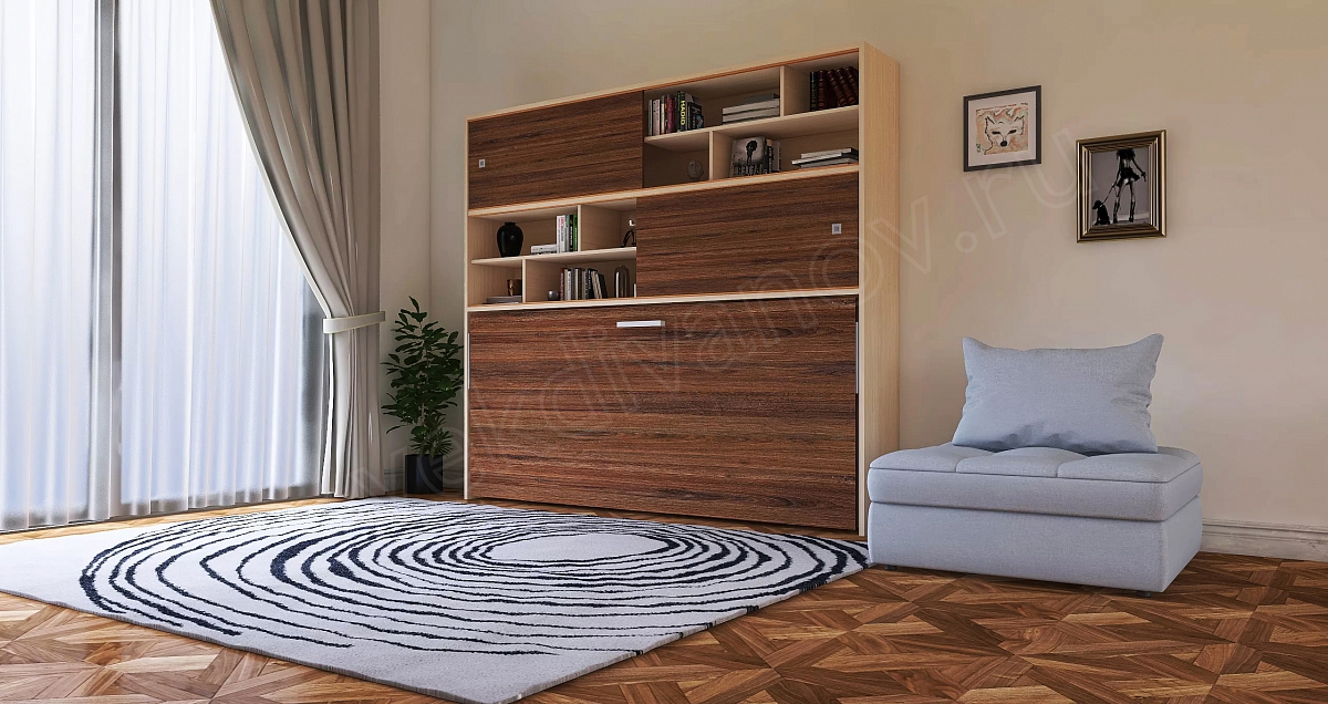 Недостаточное количество площади в маленьких квартирах заставляет владельцев искать практичную мебель с повышенной функциональностью. При помощи подъемного механизма конструкция меняет положение с горизонтального на вертикальное, скрываясь на день в шкафу.
