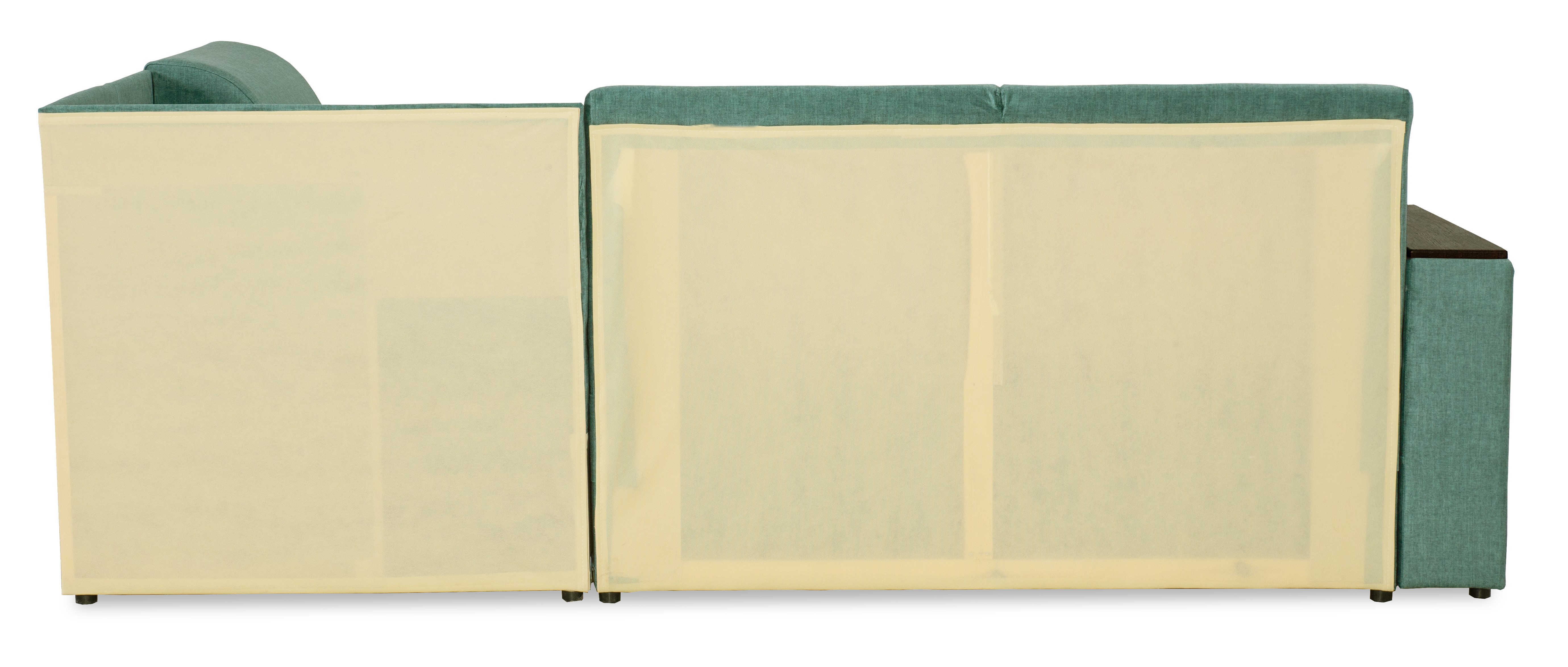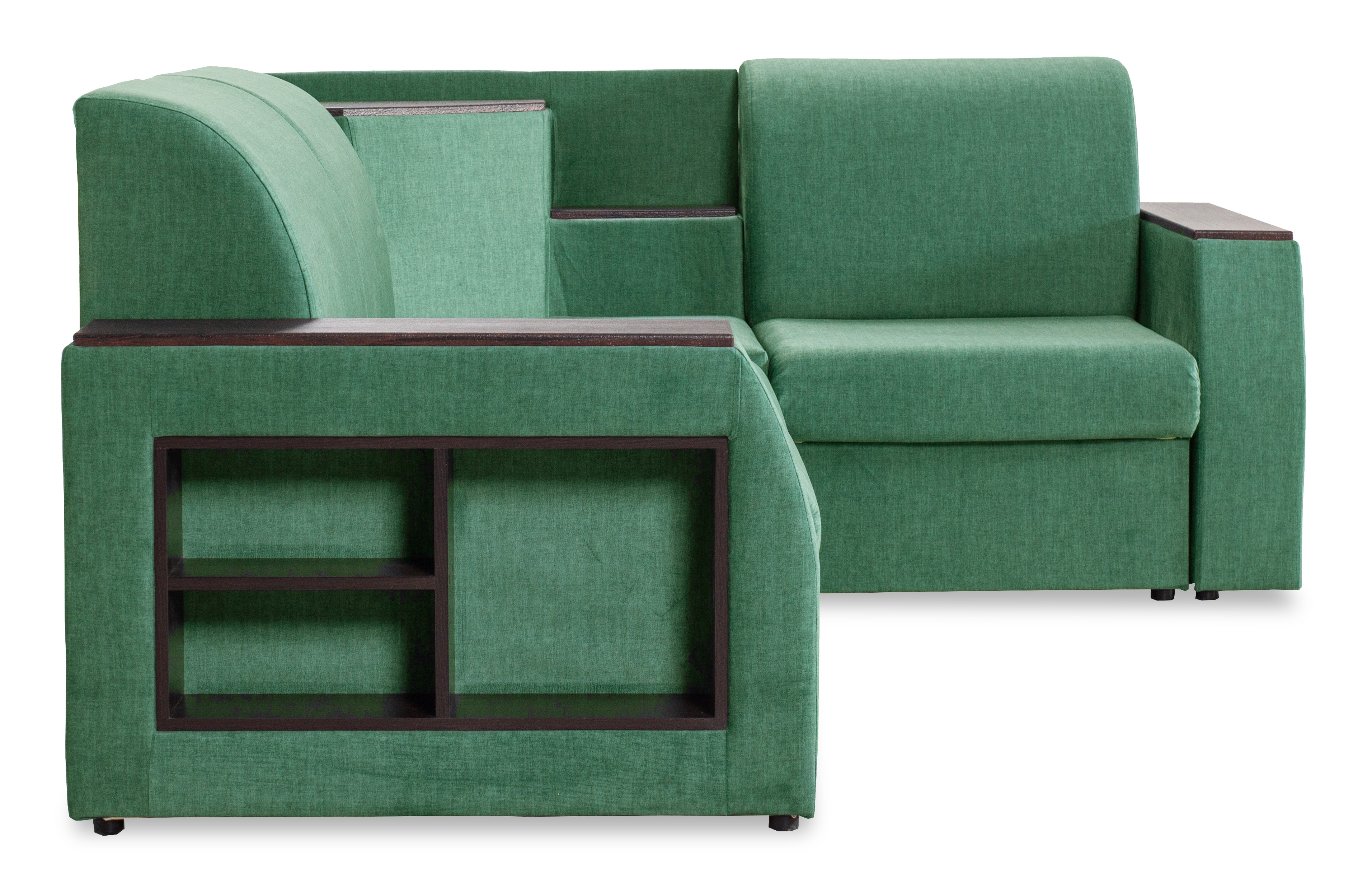 Подлокотники имеют встроенные полочки, на них стильно встанут декоративные предметы, свечи или рамки для фотографий, также аккуратно будут расположены книги. В углу дивана, располагается столешница, на которую можно ставить чашечку вкусного чая и удобно расположившись общаться со своей семьёй и гостями.