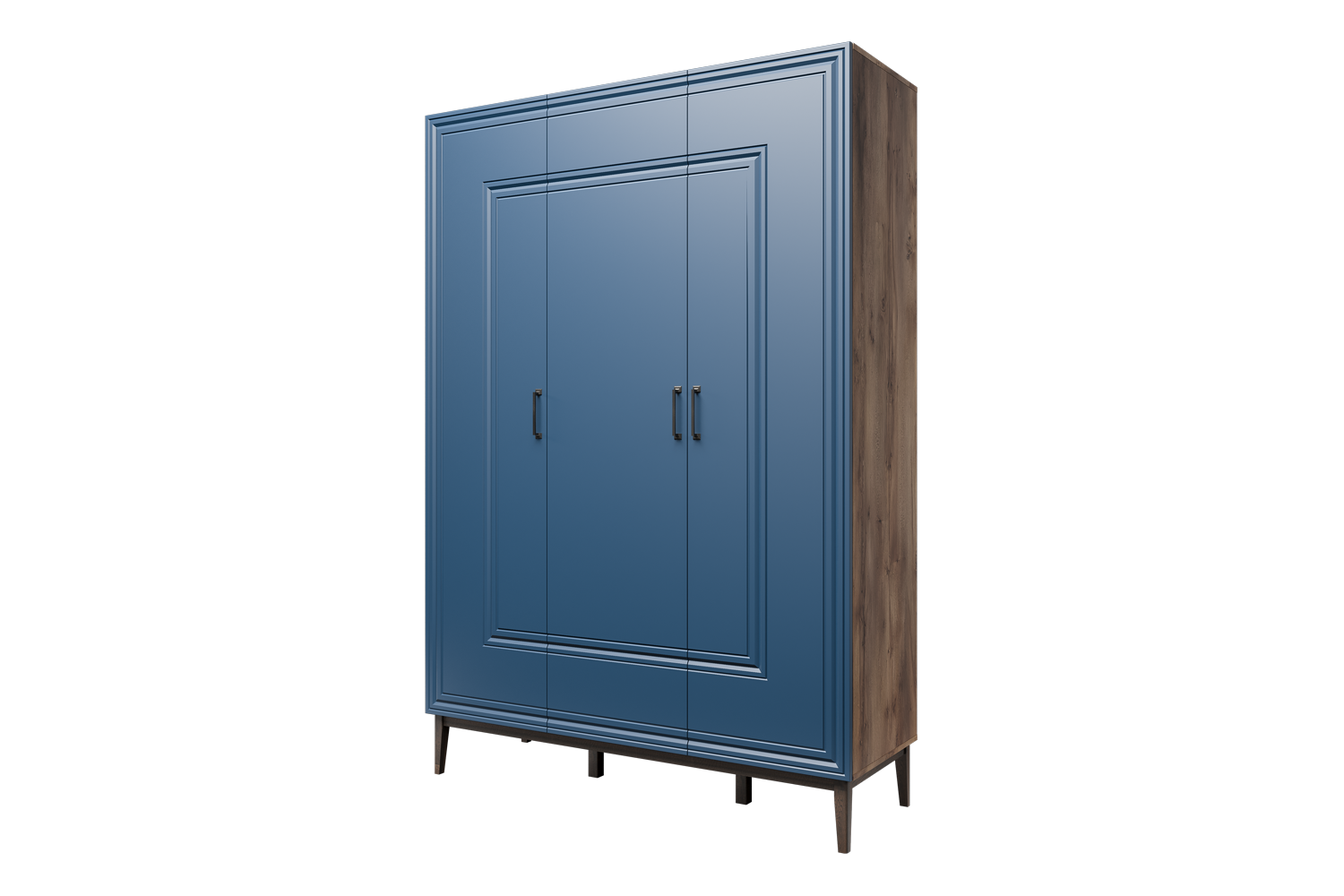 Шкаф имеет две секции. За средней и правой дверью расположена секция со штангой и двумя выдвижными ящиками. За левой дверью располагаются четыре полки для белья. Петли с доводчиками, шариковые направляющие полного выдвижения.