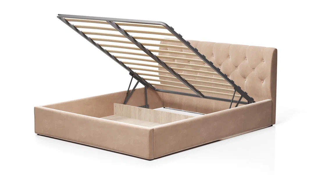 В стоимость кровати входит ортопедическое основание с подъемным механизмом и дном.