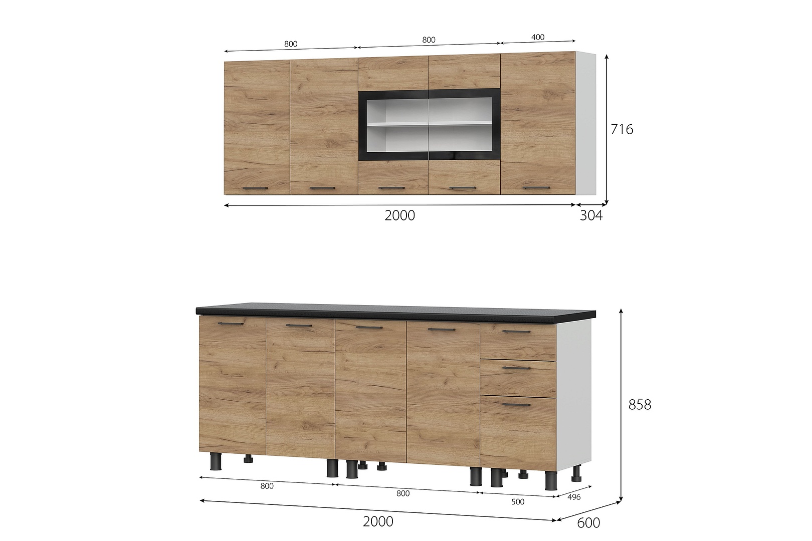 Габарит: Ш*В*Г, мм: Низ (с учетом высоты столешницы) 2000х858х600мм верх - 2000х716х304мм