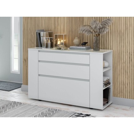 Комод с ящиками и полками Одри выполнен в современном стиле со сканди-нотками. Это практичный модуль, который будет гармонично смотреться в гостиной, спальне или прихожей. Комод оснащен 3-мя вместительными ящиками на шариковых направляющих полного, плавного и бесшумного закрывания и открытыми полками.