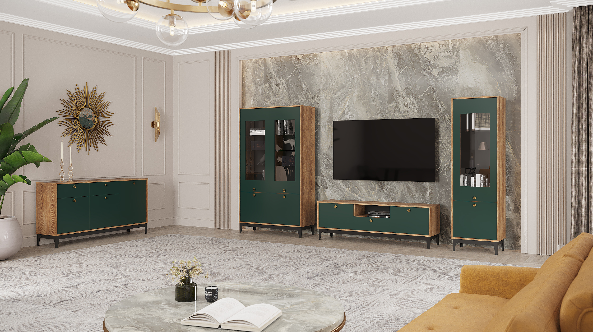 Гостиная Брасс подчеркнет уникальный характер интерьера и создаст удобную систему хранения. Высокие ножки и стеклянные вставки придают вместительным элементам визуальную легкость. Благодаря направляющим скрытого монтажа и петлям с доводчиком мебель удобна в эксплуатации.