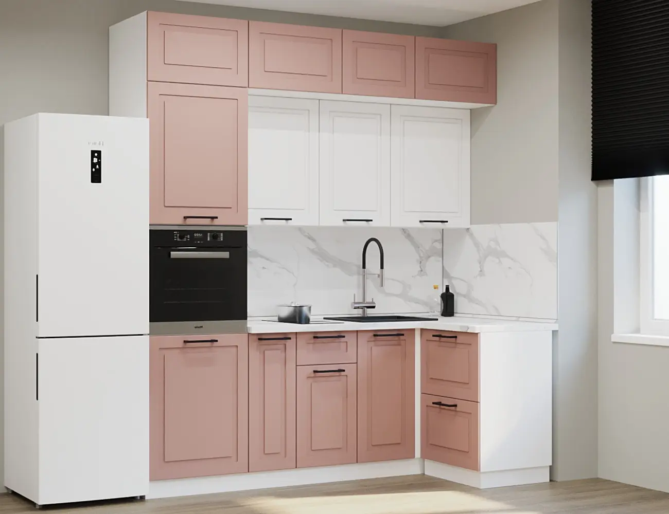 Аликанте 9: Цвет фасада: Шарли Pink, Шарли белый, корпус Серый, столешница 28мм: Каспий черный