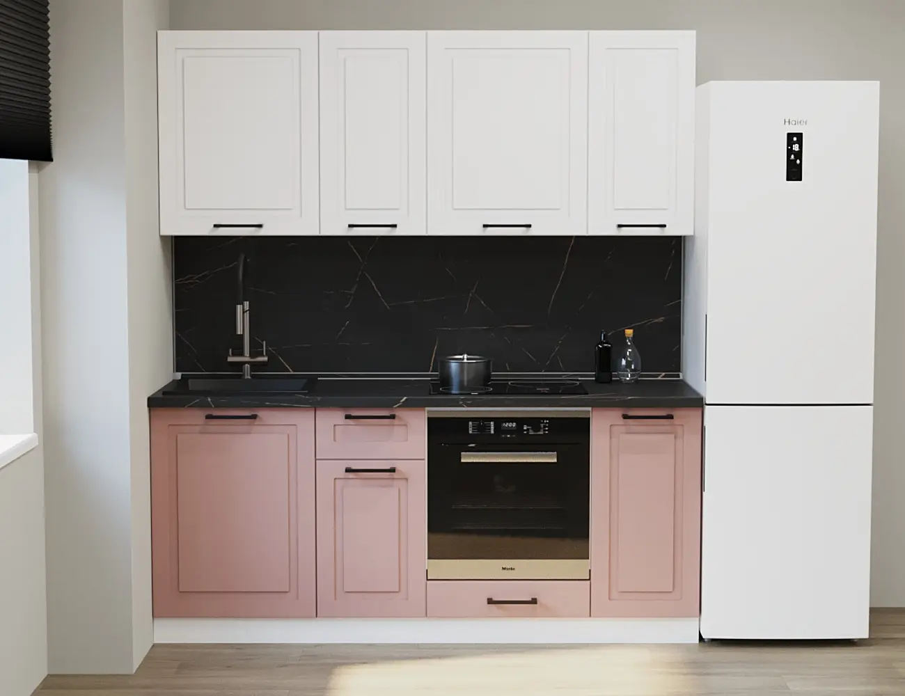 Аликанте 17: Цвет фасада: Шарли Pink, Шарли белый, корпус Серый, столешница 28мм: Каспий черное золото
