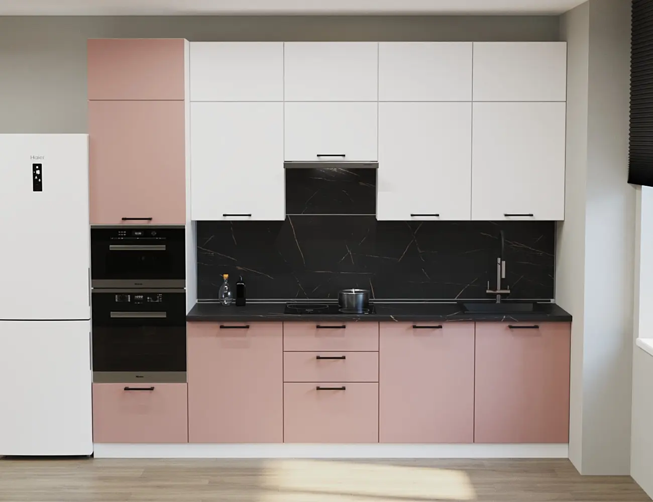 Аликанте 29: Цвет фасада: Шарли Pink, Шарли белый, корпус Серый, столешница 28мм: Каспий черное золото