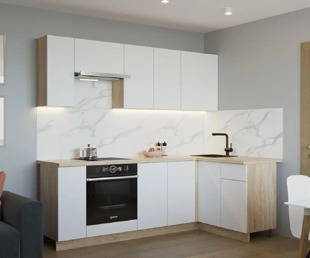 Матовые белые кухни — классика дизайна. Они практичны и универсальны, а сочетание с деревом идеально впишется в любой стиль: прованс, современная классика, минимализм.
