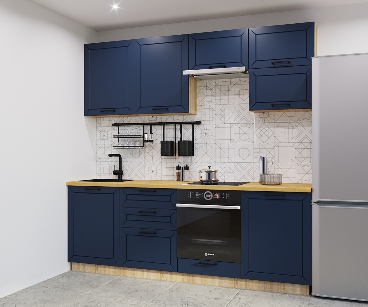 Синяя кухня всегда привлекает к себе восторженные взгляды, преображает окружающую обстановку и делает ее более легкой и свежей. Сдержанный и элегантный тандем в сочетании с грамотно расставленными яркими акцентами, будет смотреться очень уютно. Отличным компаньоном для синего станут корпус и столешница под светлое дерево.