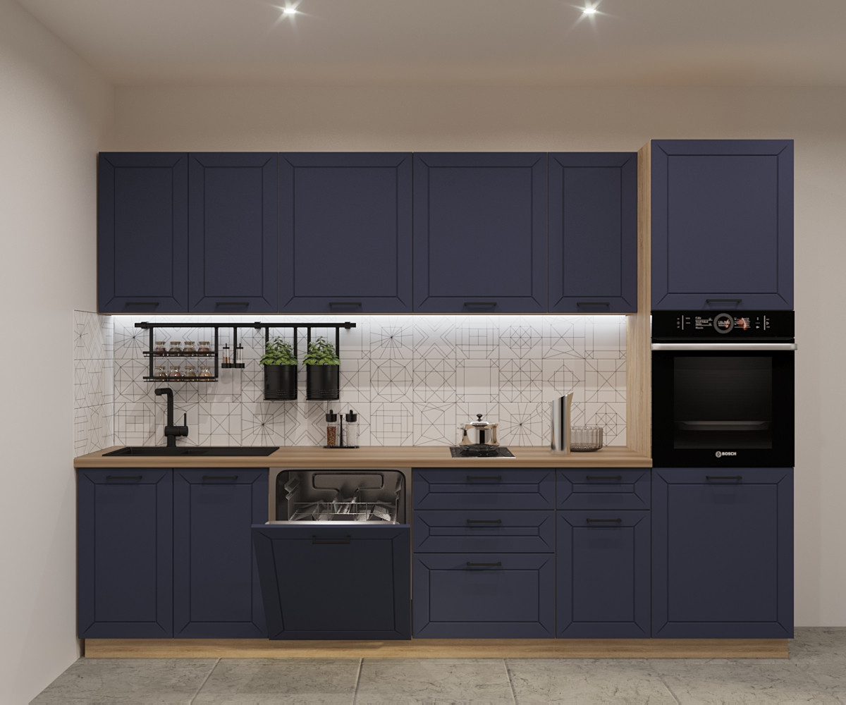 Синяя кухня всегда привлекает к себе восторженные взгляды, преображает окружающую обстановку и делает ее более легкой и свежей. Сдержанный и элегантный тандем в сочетании с грамотно расставленными яркими акцентами, будет смотреться очень уютно. Отличным компаньоном для синего станут корпус и столешница под светлое дерево.