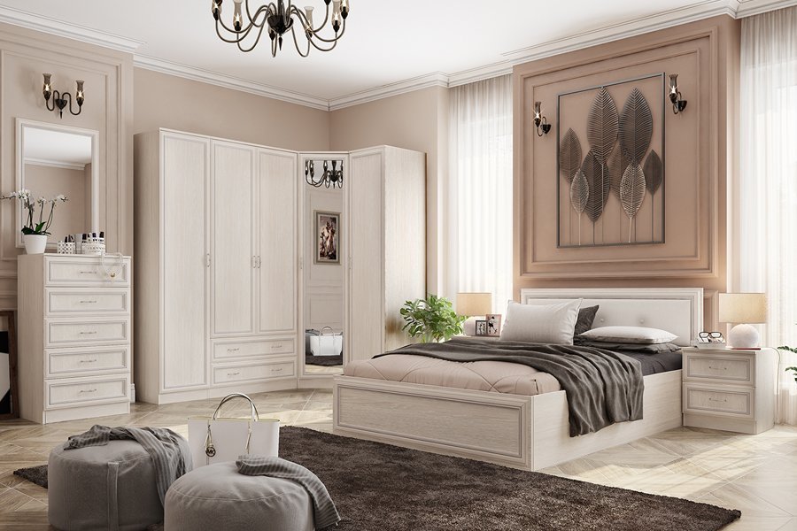 В модульную спальню "Верона" входят: кровати, комоды, основания для кроватей, шкафы для одежды, прикроватная тумба, зеркало. Корпус - ЛДСП 16 мм в цвете дуб атланта. Фасад МДФ - профиль с патиной, вставка - ЛДСП 8 мм, в цвете дуб атланта. Кромка ПВХ 1мм/0,4 мм. Направляющие – шариковые, ручка – скоба 96мм.