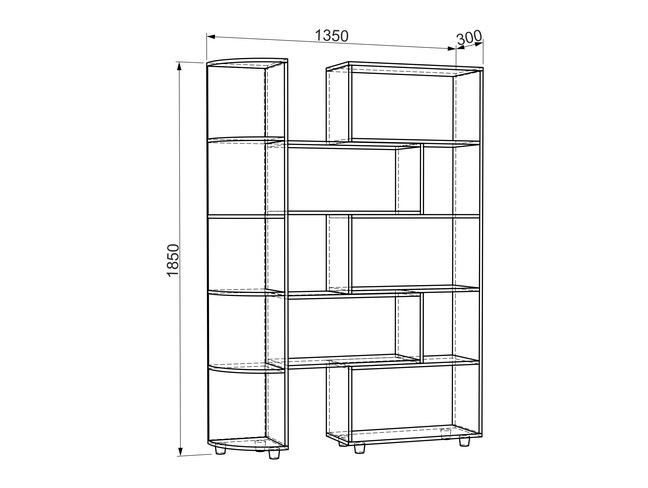 Стеллаж с угловым элементом. Вы с легкостью сможете подстроить его под любой интерьер. Стеллаж имеет 3 варианта установки: в сложенном, выдвижном и развернутом. Он отлично разделяет зоны в комнате.