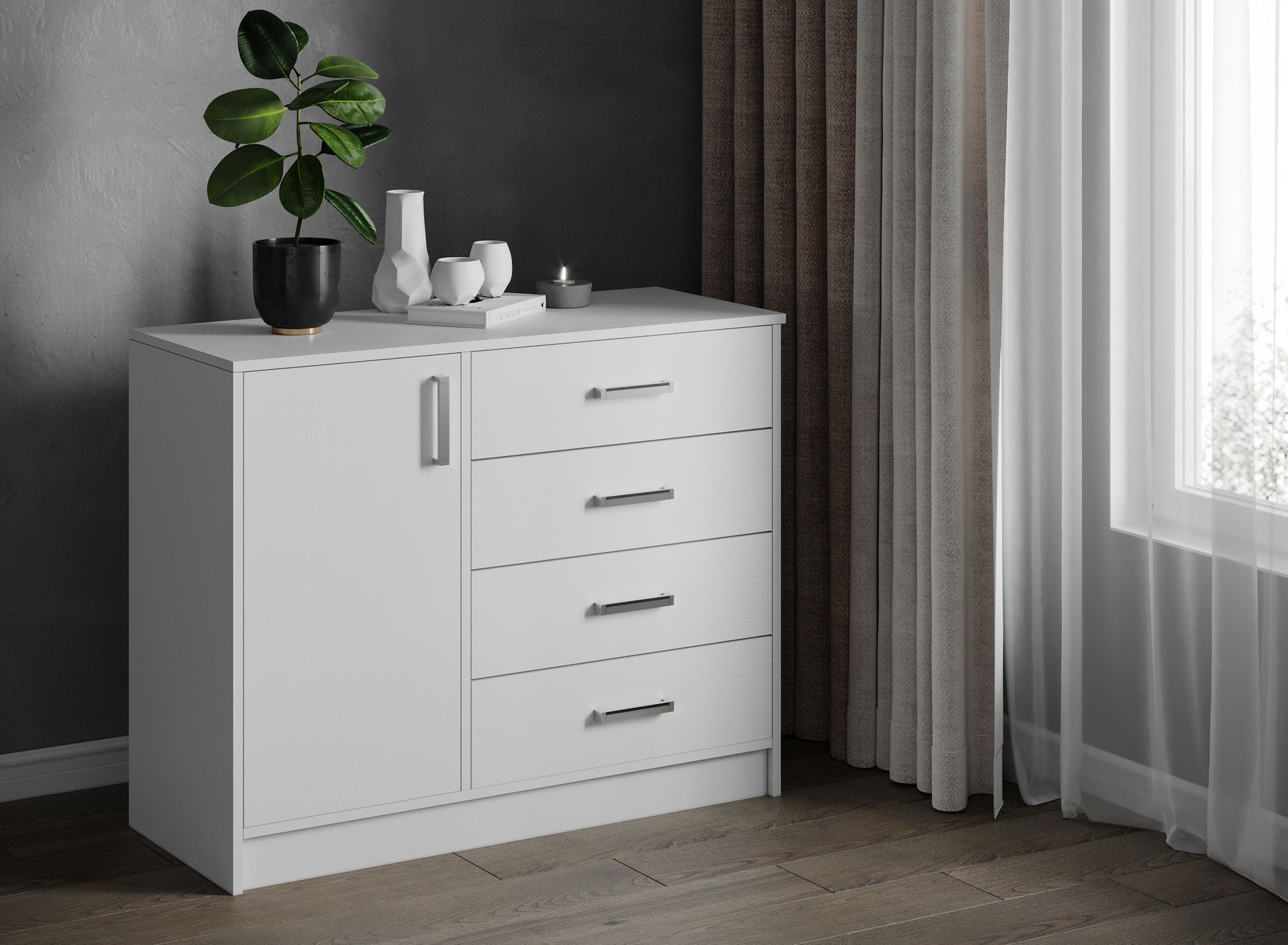 Комод включает в себя 4 больших выдвижных ящика. За распашным фасадом расположена полка.