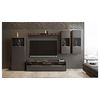 Стеклянные тонированные фасады и полки, сочетание элегантных глянцевых каркасов и красивого фасада текстуры "Джут" делает вид гостиной завершенным и эстетичным. Современный дизайн модели дополняет качественная лицевая фурнитура, которая придает дополнительную элегантность изделиям своей формой и сиянием хрома. Ножки-опоры шкафов и тумбы смещены под каркасы, что создает эффект парения в воздухе.