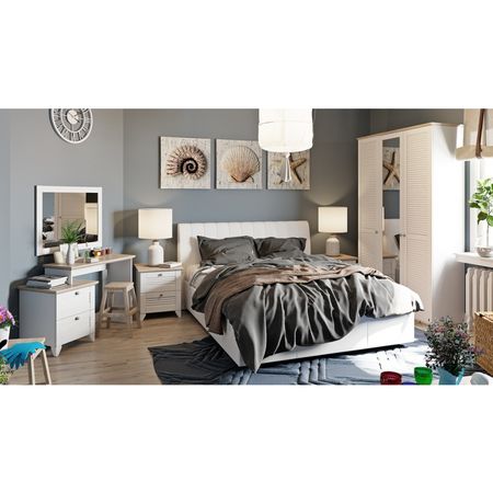 С модулями коллекции «Ривьера» будет идеально сочетаться новая мягкая кровать «Адель» в экокоже, цвет «Белый». Уют и спокойствие — это главные и непременные условия для обустройства спальни. Мягкая спинка с декоративной вертикальной отстрочкой поможет создать комфортную атмосферу в комнате. Изогнутое изголовье позволит удобно устроиться на кровати, чтобы посмотреть телевизор либо почитать книгу. Кровать с подъемным механизмом имеет вместительный короб для хранения вещей, благодаря чему можно сэкономить пространство в комнате.
