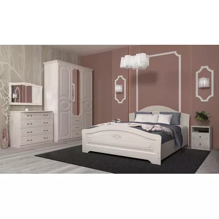 В коллекции представлены кровати с двумя видами спинок. Изголовье кроватей фигурное, фрезеровка повторяет фрезеровку фасадов шкафов. Ножные спинки могут быть фигурными или прямыми. Кроватное основание ортопедическое из гнутоклееной фанеры.
